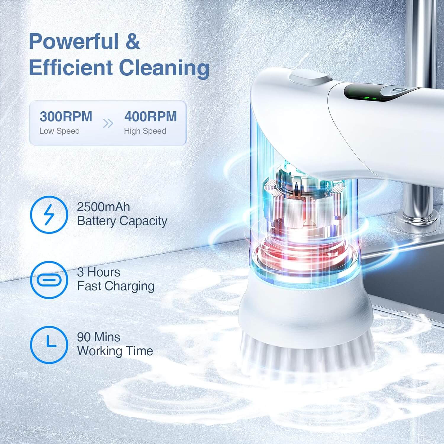 3.【Dual Speeds & Long-lasting Operation】This LABIGO cleaning brush provides 2 adjustable rotating speeds, 300RPM/400RPM, which can be matched to different speeds for different dirt. Equipped with a high-capacity 2500mAh rechargeable power battery, the electric scrubber for cleaning can be used for about 90 minutes after only 3-4 hours of fast charging. The power scrubber is powerful enough to remove stubborn stains effectively on tub, tile, stovetop, car, grill, etc.