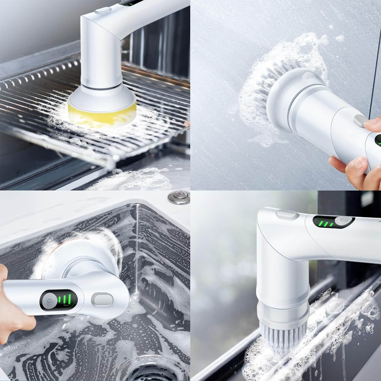 1.【One for All】Come with 5 kinds of replaceable brush heads, the electric spin scrubber meets your different cleaning needs. The Flat brush is suitable for floor, tile, oven, and stove. The Corner Brush is great for cleaning window sillings, corners, and tight places, even wheels. The Sponge Brush is recommended for cookers and glass surfaces. The Scouring Brush is the right choice for a kitchen stovetop or oven.
