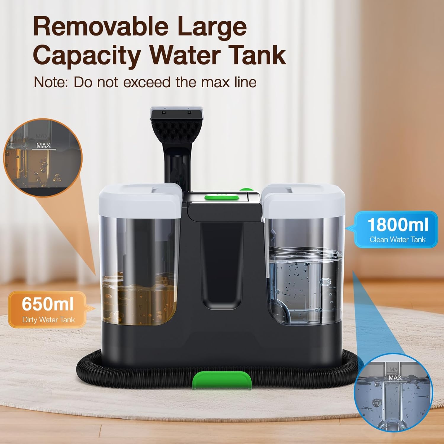Large Dual Water Tanks: Our portable small carpet cleaner features two independent water tanks: a 1800ml clean water tank, combined with a 650ml dirty water tank, eliminating the need for frequent refills, it allows you to clean your entire home in one go. This split design makes it easy to manage when to refill or empty the waste water tank. (Note: Do not exceed the maximum fill line, as this may reduce suction power.)